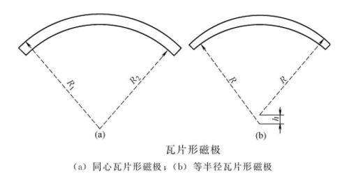 在永磁電機(jī)中,瓦片形磁極應(yīng)用廣泛。瓦片形磁極通常有同心瓦片形磁極和等半徑瓦片形磁極兩種,如下圖所示。由于燒結(jié)釹鐵硼材料的毛坯為長方體,一般采用線切割方法加工,同心瓦片形磁極的材料利用率較低,一般為40%~50%。采用等半徑瓦片形磁極結(jié)構(gòu),既可提高材料利用率,又可降低線切割加工費(fèi)用,永磁體材料利用率可提高到80%。