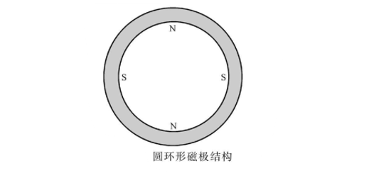 環(huán)形磁極如下圖所示,為一整體的圓環(huán),具有結(jié)構(gòu)簡單、加工和裝配方便等優(yōu)點(diǎn),在永磁直流電機(jī)中應(yīng)用廣泛。其主要缺點(diǎn)是材料利用率低,在幾何中性線上存在磁場,不利于永磁直流電機(jī)的換向。