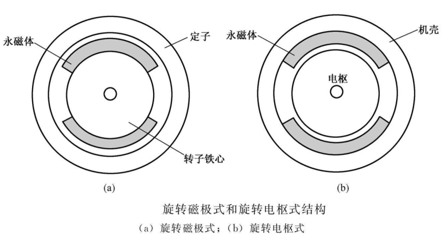 按永磁體所在的位置不同,可分為旋轉(zhuǎn)磁極式和旋轉(zhuǎn)電樞式。圖(a)為旋轉(zhuǎn)磁極式磁路結(jié)構(gòu),永磁體在轉(zhuǎn)子上,電樞是靜止的,永磁同步電動(dòng)機(jī)、無刷直流電動(dòng)機(jī)都采用該種結(jié)構(gòu);圖(b)為旋轉(zhuǎn)電機(jī)區(qū)式磁路結(jié)構(gòu),其永磁體在定子上,電樞旋轉(zhuǎn),永磁直流電機(jī)采用該種結(jié)構(gòu)。
