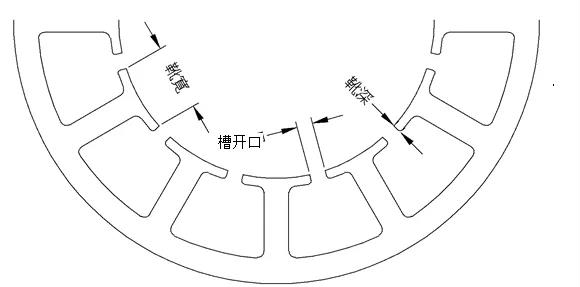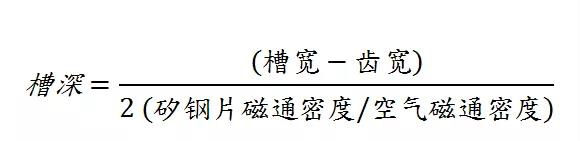 槽開口尺寸決定后,槽寬就為已知,再加上齒部寬度尺寸與齒部矽鋼片磁通密度設(shè)計值,則可計算槽深尺寸。一般常見之矽鋼片磁通密度設(shè)計值為1.6T(特斯拉:表示單位面積流經(jīng)的磁力),而空氣的磁通密度為0.6T,其中差了2.67倍;則槽寬減去齒寬后,再除上2,以獲得單側(cè)尺寸,后面再除上空氣與矽鋼片的磁通密度比例差2.67,即可得到蕞小槽深尺寸,若于靴部與齒部銜接處,加入導(dǎo)角或斜角設(shè)計,小槽深尺寸可以進(jìn)一步縮短空間。