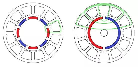 首先要知道電機(jī)的槽極配關(guān)系,也就是一極會對應(yīng)到幾齒數(shù)量,來決定軛部與齒部的關(guān)系式。以下圖為例,則左方定子軛部會流經(jīng)的磁通與單一齒部的一致,則小軛部需求寬度與齒部同寬即可;右方例子中,軛部密集處會流經(jīng)三個齒部的磁通,因此軛部小寬度應(yīng)為齒部寬度的三倍,方為合理的關(guān)系。