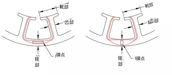 軛部:設(shè)計有三項(xiàng)需注意,分別為磁通密度、機(jī)械強(qiáng)度及鉚合點(diǎn)問題,先由簡單的鉚點(diǎn)設(shè)計來說,基本上要先考量矽鋼片堆疊后的重量來決定鉚點(diǎn)數(shù)量,過多的鉚點(diǎn)數(shù)會影響磁力通過及機(jī)械強(qiáng)度問題,合理的鉚合強(qiáng)度,鉚點(diǎn)數(shù)越少越好。下圖表示鉚點(diǎn)的方向好與磁通方向一致,降低對磁通影響程度。