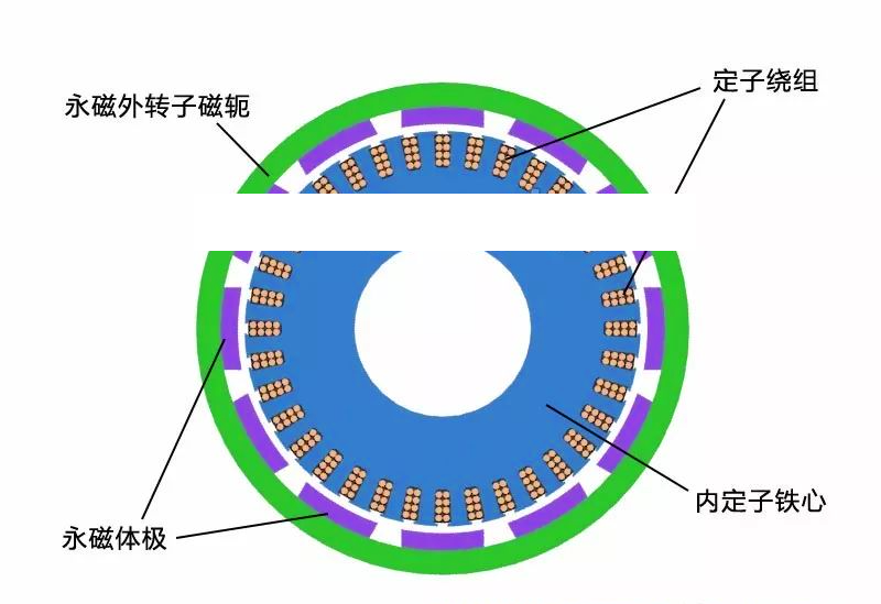 2、永磁體積大小。外轉子永磁體積小,軸向尺寸小,系統(tǒng)運行穩(wěn)定性好。內轉子永磁體積大,軸向尺寸對應也就更大,重心高,運行穩(wěn)定性差。