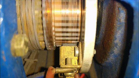 換向器由兩個(gè)半圓段構(gòu)成,連接處由絕緣材料隔開(kāi),兩段換向器轉(zhuǎn)動(dòng)分別與碳刷連接,碳刷會(huì)重復(fù)連接到符合推動(dòng)力的那段換向器,這樣重復(fù)電機(jī)就轉(zhuǎn)動(dòng)起來(lái)了。