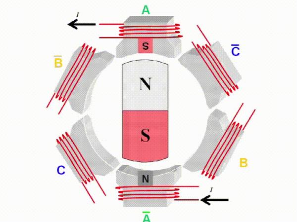 隨著電機(jī)轉(zhuǎn)動(dòng),給不同線圈或同一線圈不同兩級(jí)通電,使線圈產(chǎn)生磁場(chǎng)兩極與靠近永磁鐵定子的兩極有一個(gè)角度,通過(guò)同極相斥和異極相吸產(chǎn)生力量,推動(dòng)電機(jī)轉(zhuǎn)動(dòng)。
